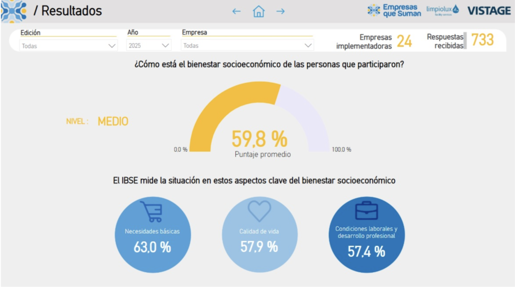 En total, respondieron más de 730 colaboradores, y el puntaje general promedio fue de 59,8%, lo que indica un nivel medio de bienestar socioeconómico entre las personas que participaron.